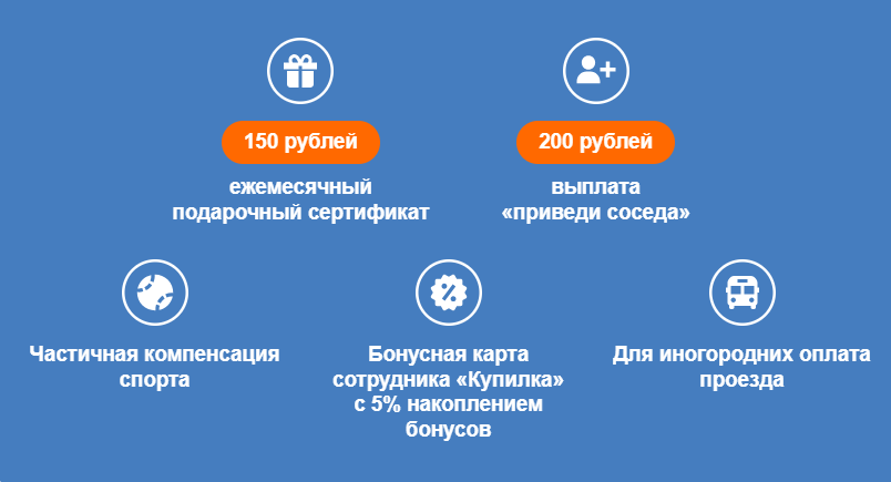 - Бонусная карта сотрудника «Купилка» с 5% накоплением бонусов;